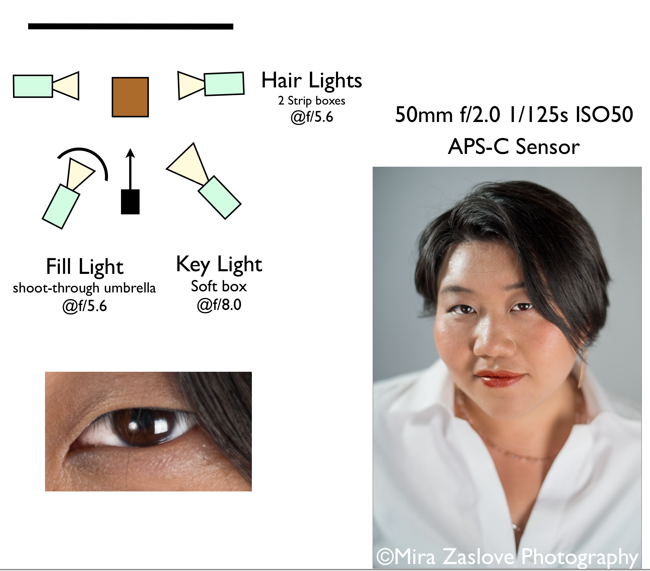 Narrow depth of field lets you focus in on the eyes and lets the other elements drift off. The lighting setup was pretty straight forward and shown below. I used a softbox a bit off-axis exposed at f/8.0 as the key light, then used a shoot-through umbrella exposed at f/5.6 as the fill light, and then two strip boxes shooting down as hair lights exposed at f/5.6. These are pretty strong hair lights, which gave a nice shine to her hair.