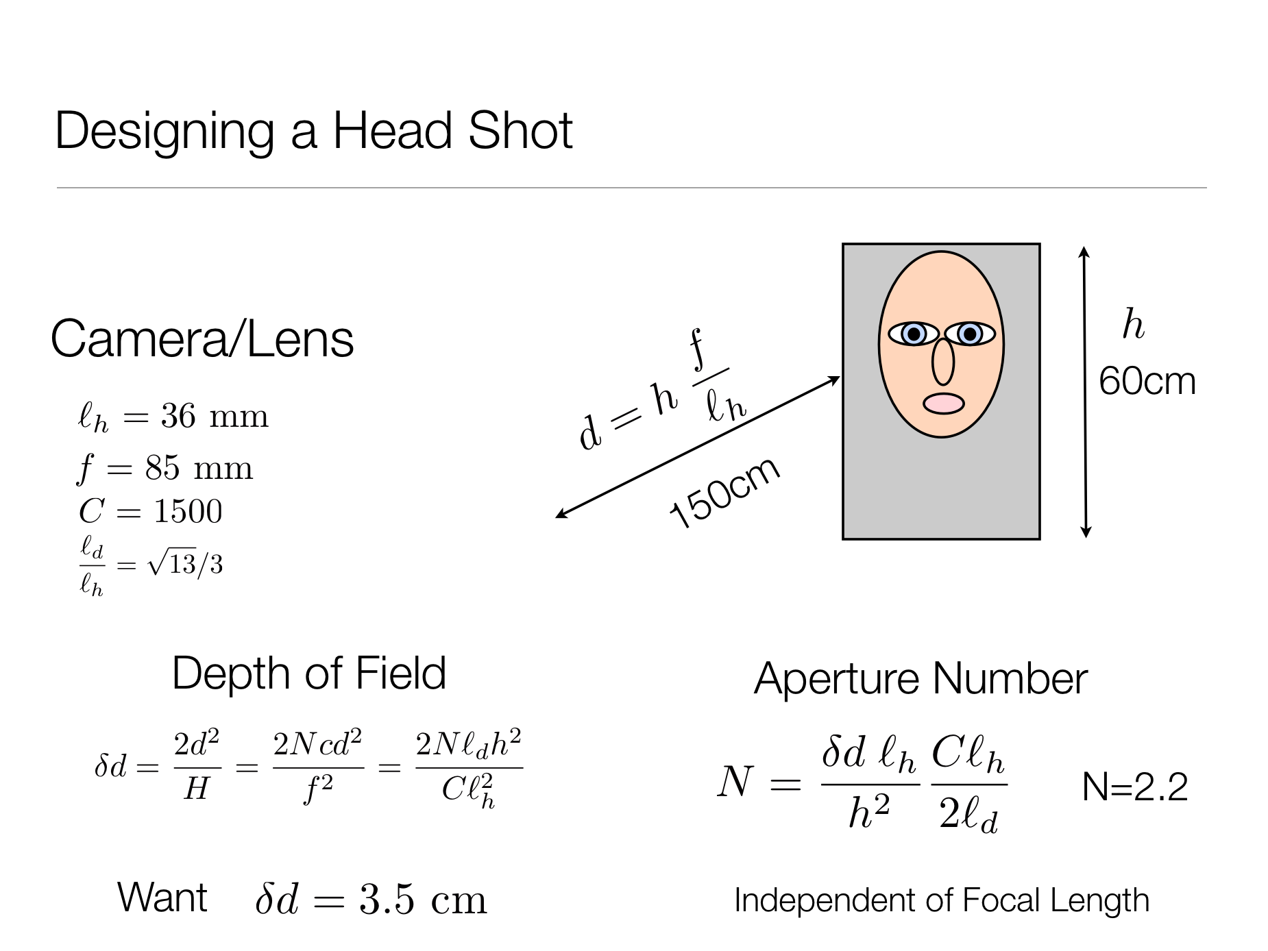 Another interesting feature about narrow depth of field head shots is that there is a minimal aperture you should ever use. If you frame a portrait head shot, it will be about 60cm tall. You always want to have about 3.5cm in focus. Now if you change focal length, keeping the aperture number fixed and keeping the framing of the shot, the hyperfocal distance will change, but the distance to the shot divided by the hyperfocal distance stays fixed. For a full frame camera, this works out to an aperture number of N=2.2, while for a APS-C crop sensor it works out to be N=1.6. I’ve attached a slide showing how the math works out.