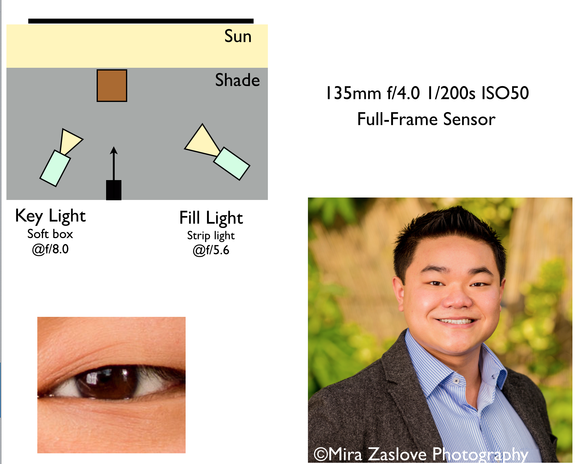 This is the last of the shots that for the outdoor headshot round. It is a similar to the others in that it is a two light setup with the model in the shade and the background being lit by late-day sun. The two lights are a soft box coming in from the left acting as the key light and exposed to f/8.0 and the fill light being a strip box and coming in from the right and exposed to f/5.6. I shot at f/3.5 in this case using a neutral density filter to tamp down the light. You can identify the lighting via the catch lights easily. The lighting worked out pretty well because there wasn’t any breaking on the highlights of the skin, which can easily happen with lighting when you aren’t using powder.