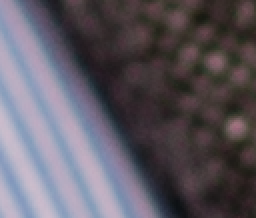 If there is one thing that is missing from the shot, it is a good hair light. His hair is nondescript and not dynamic. Unlike with people with long hair, you often need a third light coming down from above to really get good highlights on short hair, particularly dark hair. I used f/3.5 because gave me a reasonably narrow depth of field. I was about 10 feet away from the subject and the background was another 15 feet away. The depth of field was about 4 inches in this case, plenty wide to get his whole face in tack-sharp focus, but narrow enough that the background would dissolve reasonably well. If you aren’t familiar with depth of field calculations, there’s a handy website that will let you work it out at Depth Of Field Master. Zooming in on his shirt and blazer illustrates the fall of focus. The first crop is near the middle of his shirt and you can see each thread beautifully well, while the second shows the shirt falling under the blazer and the focus is softening appreciably.
