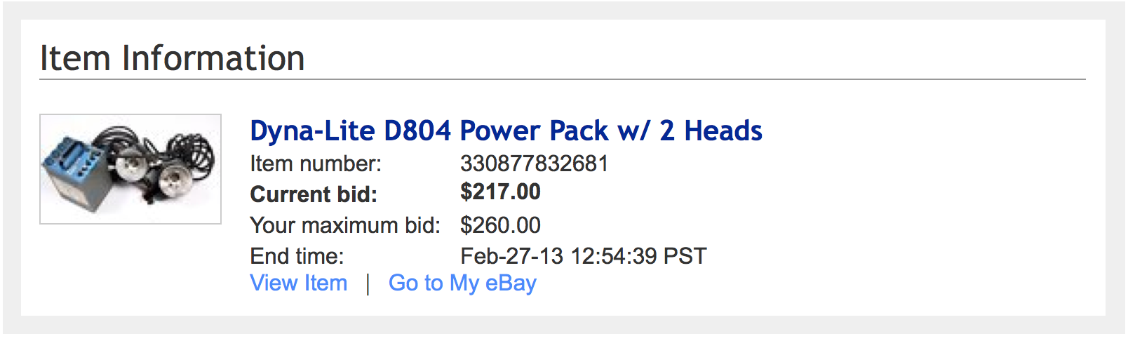 Lighting equipment is expensive and so I spend a reasonable amount of time searching out used equipment on Ebay. Craigslist tends to be too small of a market even in the SF Bay Area to get a good selection of equipment on a regular basis. I got my favorite lens, the Sony 135mm f/1.8 Carl Zeiss, on Ebay for 1/3rd off the nominal price.